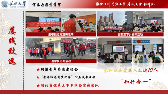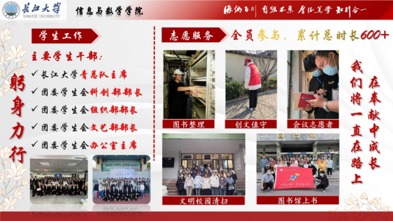 在学生工作中,支部成员担任多个重要职务,如新葡的京集团3512vip青总队主席、团委学生会科创部部长、组织部部长等,积极参与学校的各项管理和服务工作。在志愿服务方面,全员参与,累计服务时长超过600小时,涵盖图书整理、创文值守、会议志愿服务、文明校园清扫等活动。此外,支部还积极组织返母校志愿宣讲、返家乡志愿活动和暑期三下乡支教活动,其中暑期三下乡支教团队荣获湖北省优秀三下乡社会实践团队,以实际行动践行“知行合一”的理念,展现出强烈的社会责任感。