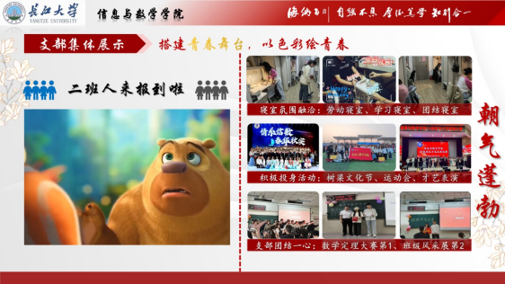 数学12202支部是新葡的京集团3512vip的一个充满活力与进取精神的集体,共有团员28人。该支部思想引领成效显著,严格落实“三会两制一课”,入党积极分子众多。学习成绩突出,年度平均绩点3.32、四级通过率100%,全院排名第一,多人获得奖学金。在学习创新方面,积极参与大创项目,在多项学科竞赛中获奖。组织运行高效,班团一体化建设有机融合。宣传展示形式多样,积极推广支部活动。在各类活动中表现出色,荣获2023-2024数学定理大赛第一名、班级风采展第二名等荣誉,还获评湖北省优秀三下乡社会实践团队,是一个全面发展、成绩优异的团支部。