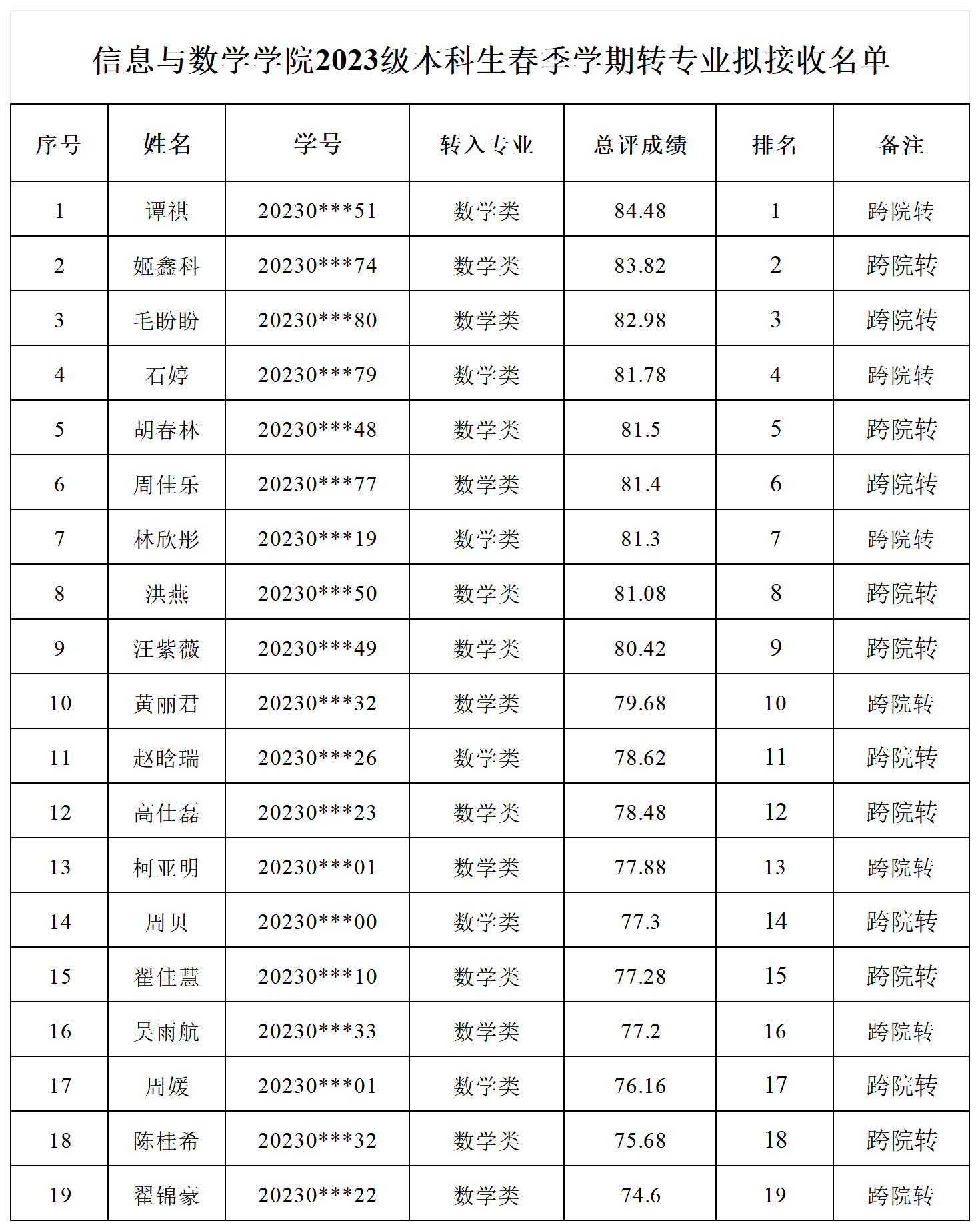 根据《新葡的京集团3512vip普通本科生专业分流与转专业管理办法(试行)》(长大校发〔2019〕260号)精神,按照《关于开展2023级普通本科生春季学期转专业工作的通知》和《新葡的京集团3512vip2023级普通本科生转专业考核工作方案》要求,经学生本人申请,学生所在学院和本科生院资格审核,新葡的京集团官网对拟转入学生进行了面试考核。现将新葡的京集团3512vip2023级本科生春季学期转专业拟接收名单予以公示。