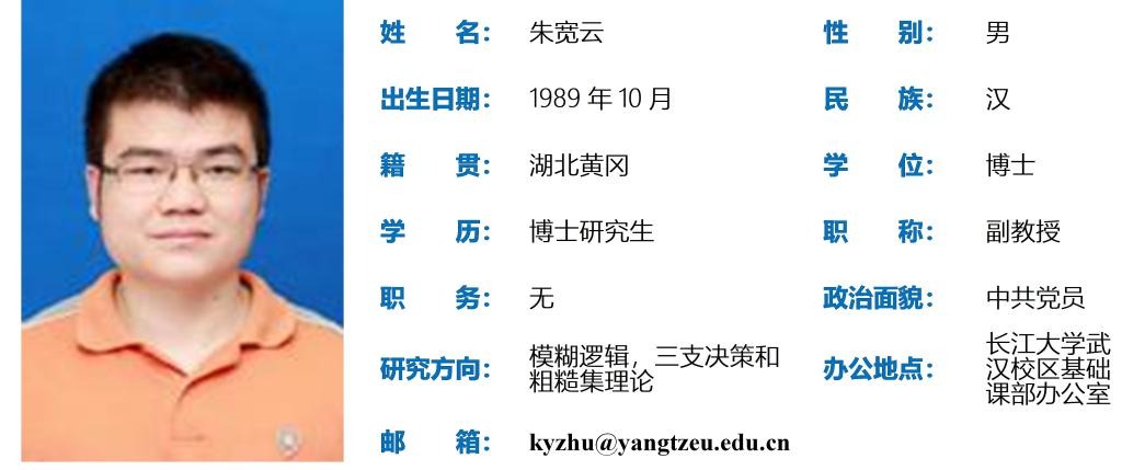 朱宽云,男,1989年10月出生,博士研究生,副教授。主要从事模糊逻辑、三支决策和粗糙集理论研究。2019年6月毕业于武汉大学数学与统计学院,同年7月入职新葡的京集团3512vip。以第一作者(或通讯作者)公开发表SCI/EI论文50余篇,其中包含《Fuzzy Sets and Systems》、《Information Sciences》、《Soft Computing》、《Journal of Intelligent & Fuzzy Systems》、《Journal of Multiple-Valued Logic & Soft Computing》以及《International Journal Machine Learning and Cybernetics》。尤其是近几年来以第一作者连续在SCI数学类一区Top期刊《Fuzzy Sets and Systems》(IF:3.9)上发表7篇论文。 论文“A novel soft rough fuzzy sets:Z-soft rough fuzzy ideals of hemirings and corresponding decision making”在Web of Science引用113次。主持完成国家自然科学基金青年项目(No. 12001062)和湖北省自然科学基金青年项目(No. 2020CFB368)各一项。2020年12月入选新葡的京集团3512vip第四批人才计划“菁英人才”系列。
