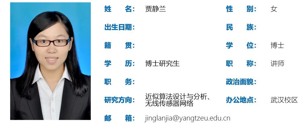 贾静兰,女,博士,讲师,主要研究方向为近似算法设计与分析、无线传感器网络。主持湖北省教育厅科学技术研究计划指导性项目1项;发表学术论文5篇;获得新葡的京集团3512vip教学质量优秀奖1项。